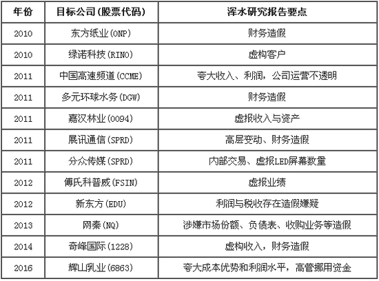 自2010年因做空东方纸业一战成名以来,浑水狙击的中概股对象包括:嘉汉林业(在浑水报告发布当天股价狂泻64%)、网秦(股价暴跌近50%)、大连绿诺干脆(在浑水报告发布之后仅23天就被纳斯达克摘牌)。