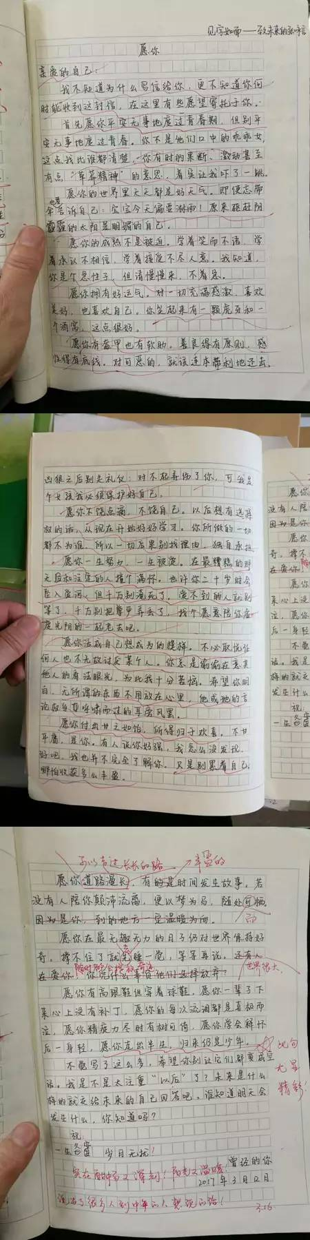 一摞作文本摆在办公桌上,看到《愿你》时,北京四中语文教师王允忍不住画了很多条红色波浪线,“每一句都是那么舒畅,就像泉水在心间流淌。”她抄起手机,像往常一样,拍下文章,发到了朋友圈。