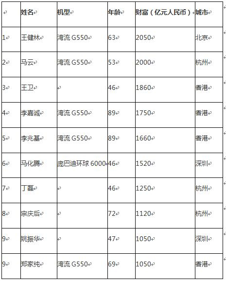 大中华区富豪榜前10的企业家和他们的公务机 来源:胡润研究院,财富数字来源于《2017胡润全球富豪榜》