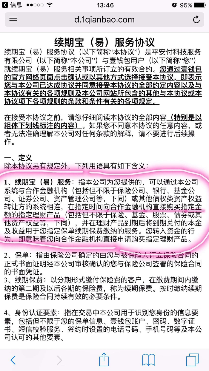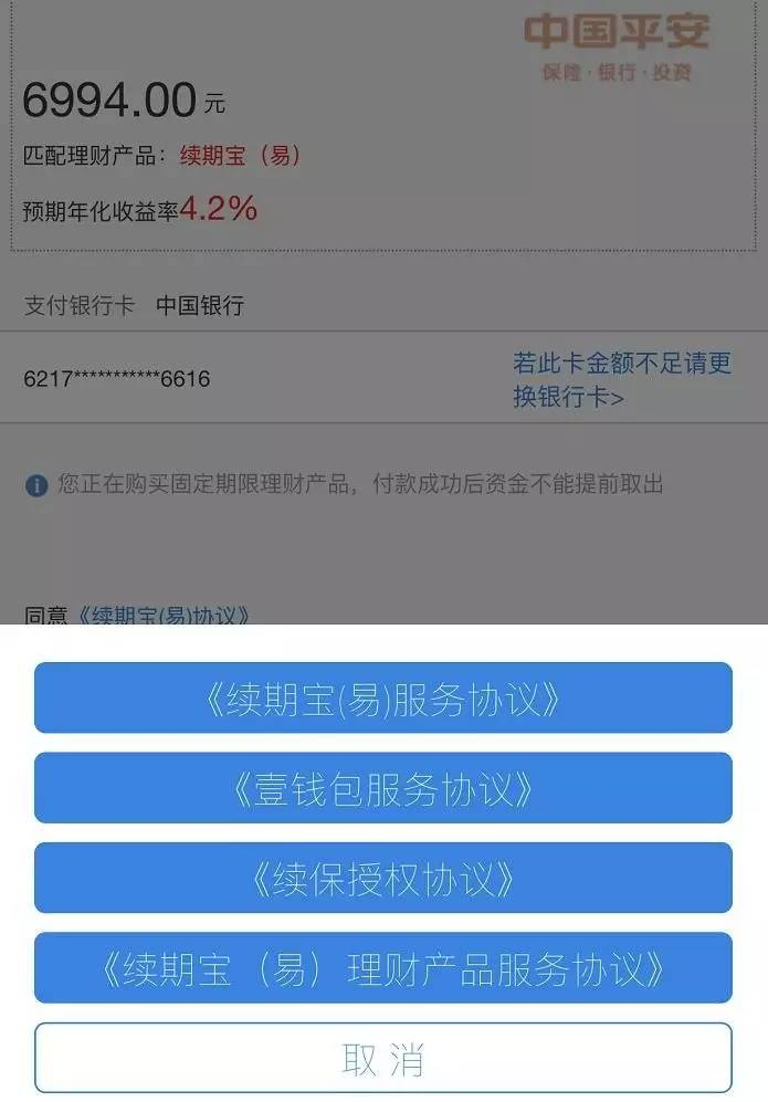 说白了就是平安福客户(不排除还有其他险种客户)提前将资金交由平安集团,平安在取得客户的授权后,帮其认购一款理财产品续期宝(易),一年后该款产品到期,本金和收益就刚好打平客户需要缴纳的保费。
