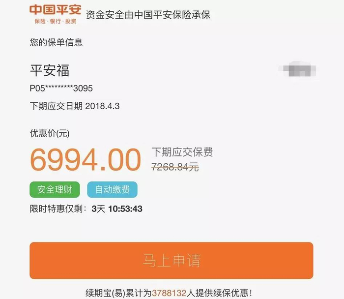 根据续期宝(易)的最新页面信息,已经有378.81万人申请了续保服务,也就是说,平安旗下的理财产品,搭着平安保险的船,一下子招揽了378.81万人购买。
