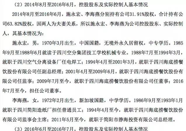 施永宏、李海燕是海底捞创始人之一。股转书显示,施永宏1994年4月至2001年3月,就职于四川海底捞任副总经理;2001年4月至2009年6月,就职于四川海底捞任监事;2009年7月至今,就职于四川海底捞任董事。李海燕则从1994年4月至今,就职于四川海底捞监事会主席。