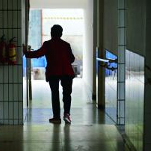 荔湾养和怡老院,一位长者扶着墙走路锻炼身体。