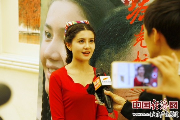 演员阿依帕丽·乌古力(饰演阿依古丽)在现场接受采访 中国经济网记者李冬阳/摄