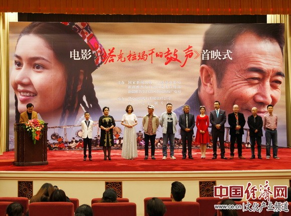 中国经济网北京4月17日讯(记者李冬阳) 今天下午,由国家新闻出版广电总局电影局、新疆维吾尔自治区党委宣传部、新疆维吾尔自治区新闻出版广电局主办,华夏电影发行有限责任公司、天山电影制片厂承办的“电影《塔克拉玛干的鼓声》首映式”在人民大会堂举办。