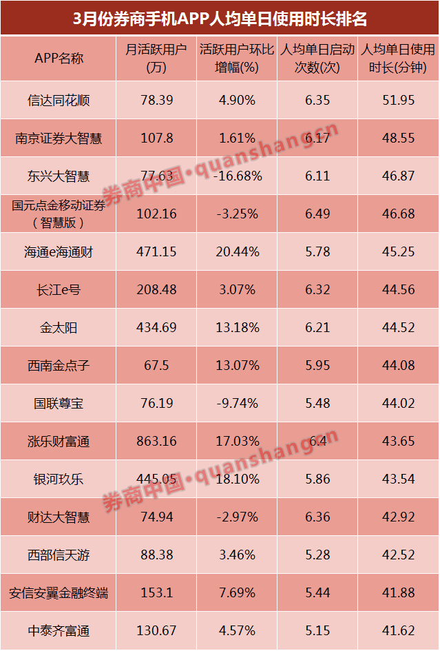 “人均单日使用时长”指标有较好表现的券商,包括信达证券“信达同花顺”、南京证券大智慧、东兴大智慧、国元点金移动证券(智慧版)、海通e海通财等券商手机APP。