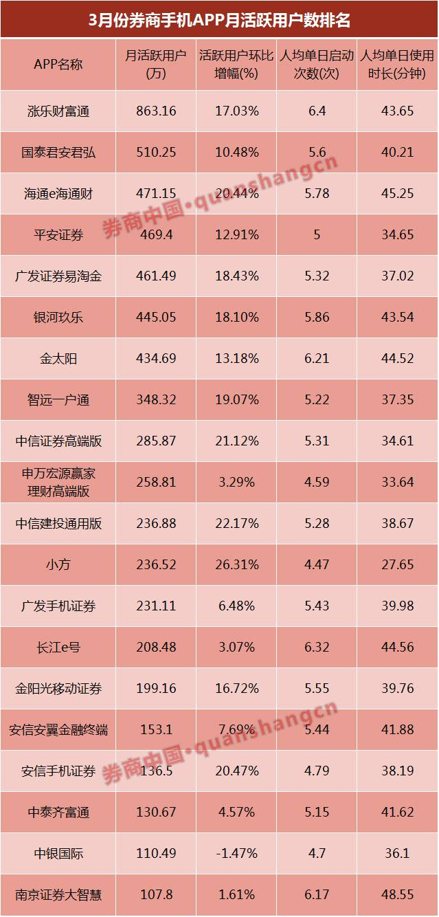 围观券商手机APP最新排名!且看活跃度、增长率、停留时间谁家强