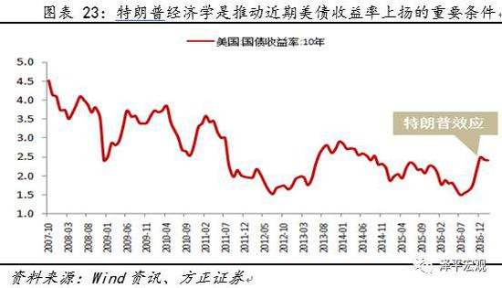 特朗普经济学是推动近期美债收益率上扬的重要条件。特朗普于2016年11月竞选成功后,“特朗普经济学”快速调高了全球通胀的预期,并引致了全球债市的断崖式调整。在美国已经进入加息周期之后,通胀预期的上升实际还是通过货币收紧加速的预期作用在市场上的。