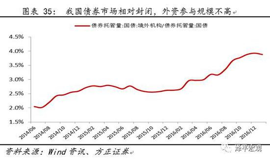 我国债券市场处于相对平稳状态的原因可能有二:其一是我国债券市场相对封闭,外资参与规模不高,即使近年来境外机构持有国债规模有明显提升,其参与比例也不足4%(相对美国32%的外资参与率,我国明显不足),国内银行又是配置债券的大户,因此需求相对平稳。