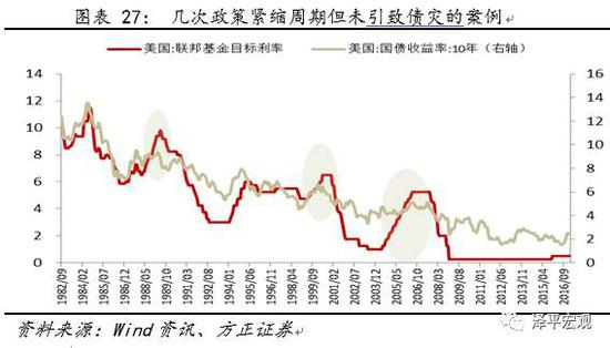比较典型的是1998-2000年美国因控制互联网泡沫连续进行了6次加息以及2004-2006年美联储因房地产泡沫而持续进行了17次加息,这两次美国加息周期虽然比较直接地导致了债券市场的下跌,但是并没有对债券市场形成债灾式的伤害。另外,在1986年-1989年那轮因通胀抬头而连续加息的周期中,只有1987年对债券市场造成了明显快速的调整,而后联邦基金目标利率一路从6.8%加至9.8%,10年期美债收益率反而从9.4%下降了50bp至8.9%。