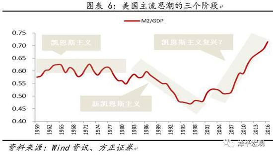 2008年之后,美国再次运用了大幅宽松的凯恩斯主义式政策来挽救金融危机,M2/GDP从50%左右飙升至70%,有很多观点认为这段时期属凯恩斯主义的回潮。这段时期属于真正的凯恩斯主义的回潮,还是阶段性应对危机之举,还需要观察。