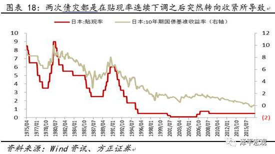 日本历史上的债灾也可基本用货币政策转向来解释。发生于1979年8月-1980年3月以及1989年8月-1990年9月这两次债灾都是在贴现率连续下调、货币政策宽松之后突然转向收紧所导致的。