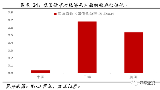 我国债券市场对经济基本面的敏感性相对美国和日本来说是偏低的,因此虽然存在基本面乃至货币对债券收益率的影响,但影响偏弱。从名义GDP每变化一个百分点对10年期国债收益率的冲击来看,日本债券市场的受冲击幅度为0.68,美国为0.54,而中国只有0.04。