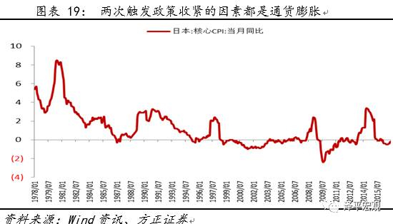 这两次触发政策收紧的因素都是通货膨胀,前者是第二次石油危机带来的震动,而后者则是因广场协议后日元升值、经济衰退等现象,倒逼日本持续凯恩斯刺激后带来的一轮通胀隐患和资产泡沫。
