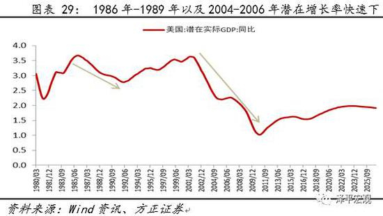 1986年-1989年以及2004-2006年这两个阶段虽然基本面和通胀起来的速度很快,但市场当时对经济预期是悲观的,因此,市场并不相信货币紧缩的持续性会很强。从美国潜在GDP增速来看,1985年-1991年、2001年-2010年是潜在增长率下滑比较明显的两段时间,当时的弱预期在很大程度上抵消了一部分债市的利空,使得在政策转向,资产轮动发生时,债券市场的抛盘并没有那么明显。