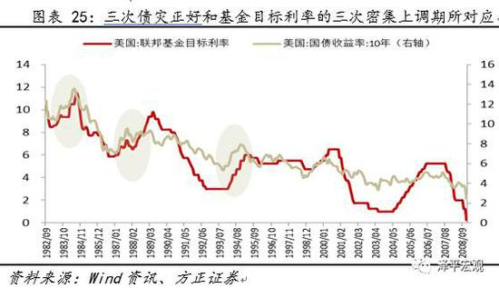 发生于1984年、1987年以及1994年的三次债灾正好和联邦基金目标利率的三次密集上调期所对应,可以推测在当时政策收紧是债灾形成的重要条件。