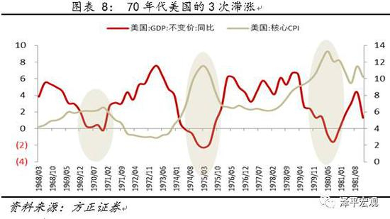 尼克松时期因经济增长下滑过快和第三次科技革命进入末期等原因,美国的经济预期出现了明显走弱,因此1973-1975年尽管因第一次石油危机出现了滞涨现象,但美联储并未给出控制通胀的决心,货币政策上的信号也不明显,仅凭通胀一己之力,并没有给市场带来过大的冲击。