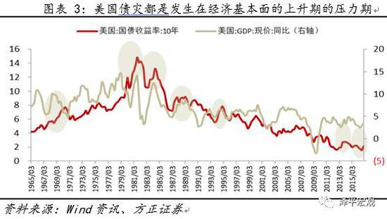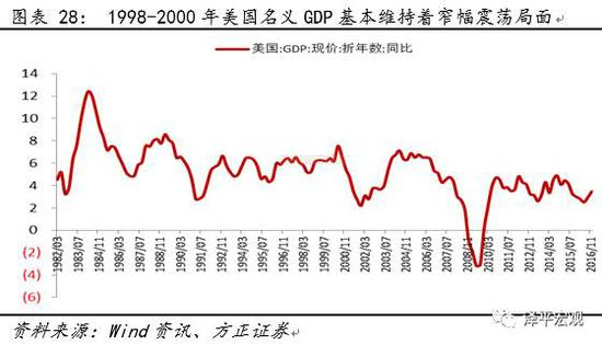 譬如说:1998-2000年的货币收紧的直接触发因素是互联网泡沫引致的通货膨胀,而事后来看,当时的通货膨胀问题并没有很严重,核心通胀率仅从2.1%上升至2.5%,故对债券市场收益率的推动也非常有限,而美国名义GDP基本维持着窄幅震荡局面,因此,基本面对债券市场的额外伤害力不足。
