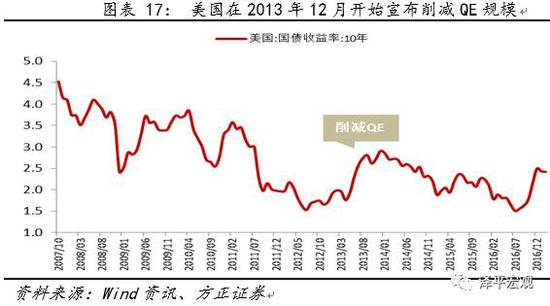 2013年美国的债券市场再次出现了类似于1969年和1979年的一幕:一旦长期积累的超发货币出现方向性的反转,将会导致债券市场的明显调整。美国在2013年12月开始宣布削减QE规模起,美国维持了6年的宽松货币政策正式转向,且在2013年下半年引发了一次债券市场的明显调整,仅仅半年时间,10年期国债收益率从1.76%飙升至2.9%。