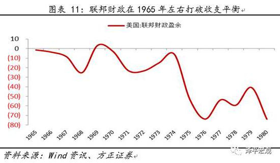 大幅财政投放和减税行动给当时的美国财政带来了比较大的收支压力,联邦财政盈余也在1965年左右开始打破财政收支平衡,开始出现了逐年增长的财政赤字,到1980年附近,美国的财政赤字已经达到了近800亿美元。