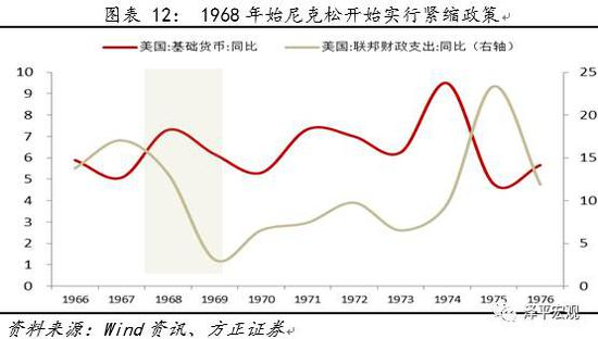 1968年始尼克松为了缓解滞涨压力,开始实行紧缩的政策,美联储也减少了货币供应,美国基础货币供应和财政支出双双减速,带来了一轮为期半年的债灾。