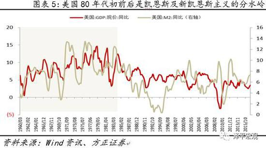 在过去的六十年里,以里根的供给学派为分水岭,美国的主流思潮可大致分为凯恩斯主义时期和新凯恩斯主义时期。从M2/GDP的趋向即可看出,60年代是以肯尼迪为代表的凯恩斯主义盛行时期,这个阶段美国主要通过增加财政开支和实行财政赤字的角度来刺激经济;而后里根经济学登上舞台,其主要宣导的是削减政府预算以及货币供应量,之后美国的主流思潮一直是在凯恩斯主义和新自由主义之间寻求某种平衡(即新凯恩斯主义),美国在货币投放上的态度明显收敛,只有在美国经济发生阶段性减速或危机时,政策才会向凯恩斯主义倾斜,运用财政刺激或货币投放挽救衰退的经济情势。