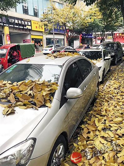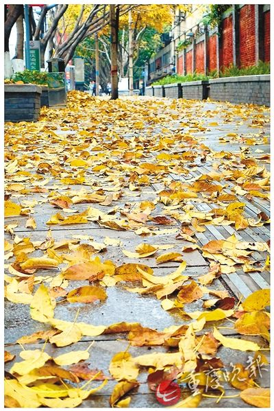 昨天一早,记者在渝中区大坪石油路街边看到,一夜大风过后,马路两侧人行道上铺满了金黄的落叶,行人从落叶上匆匆走过,远远看去,金灿灿的一片,像是铺上了一层金色的地毯。不仅如此,在渝北区花卉园街道、南岸区黄桷古道、九龙坡区杨九路等地,都出现了落叶缤纷的奇观。