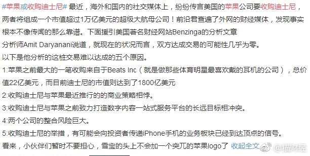 【苹果或以2000亿美元收购迪士尼】据国外多家媒体报道,苹果将以2000亿美元收购迪斯尼,具体交易为2230亿美元,其中包括9%税率。苹果若达成交易,将成为世界上无可匹敌的超级巨无霸公司,市值有望达到10000亿美元以上。(via大众网)