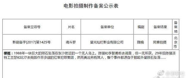 【《魂斗罗》将拍真人电影 剧本备案立项已公示】一个名为《魂斗罗》的真人电影已通过剧本备案并已立项公示,剧情简介为“1988年一块巨大的陨石落在东沙附近无人岛上。29年后陈强派特工兰瑟和比尔去捣毁红隼犯罪集团,而且真凶另有其人。”(via微博 @游研社)