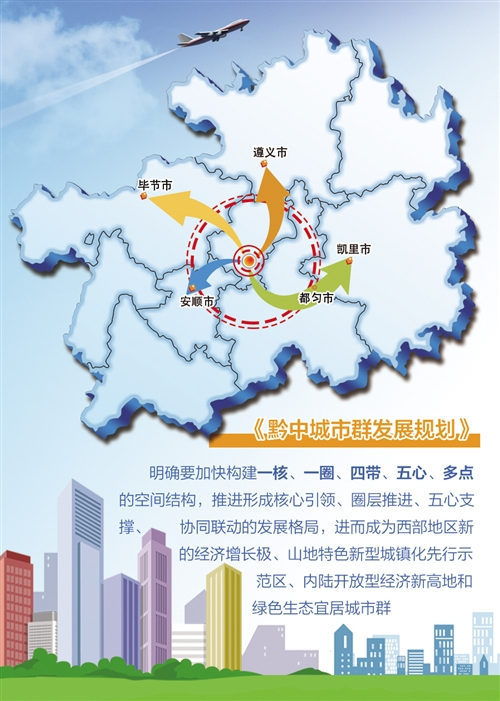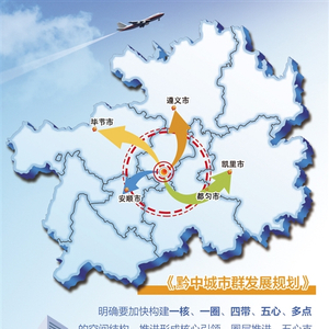 对于处于重要节点的遵义、安顺、毕节、凯里和都匀等5座区域中心城市将积极完善功能,加快人口和产业聚集,提升辐射带动功能,成为所在地区的旅游中心、商贸物流中心和产业基地。