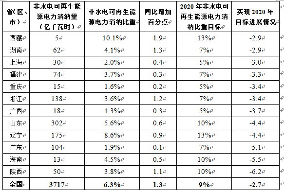 宁夏。2016年,全部可再生能源电力消纳量大幅提高,达到187亿千瓦时,占本省全社会用电量的比重为21.1%,同比上升5.5个百分点;非水电可再生能源电力消纳量为169亿千瓦时,占本省全社会用电量的比重为19.1%,同比上升5.7个百分点。风电和光伏发电均未达到最低保障收购年利用小时数要求,偏差分别为297小时和231小时。