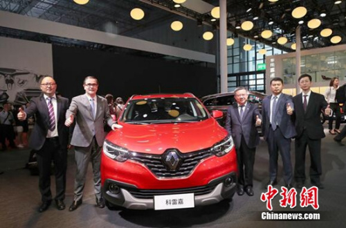 (左起)东风雷诺副总裁兼市场销售部部长陈曦、东风雷诺总裁福兰、东风汽车公司总经理、党委副书记、东风雷诺雷诺汽车有限公司董事长李绍烛、东风雷诺常务副总裁翁运忠、东风雷诺党委书记郭涛与2017款科雷嘉合影