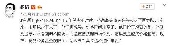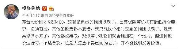 微博投资舆情分析认为:茅台股价超过400,这就是典型的抱团取暖了,公募保险等机构有最低持仓要求,必须有股,其他的股票都不靠谱,就只能找个相对安全的抱团取暖了。这就类似洪水来了,其他都被淹没,蚂蚁等小动物们就会抱团在一个地方。但这种股价适合守,不适合攻,也是大资金不得已而为之了,并不能说明投资价值。