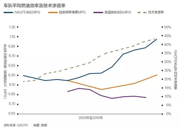 在燃油节约方面,NACFE的作用十分显著。其2016年发布的的年度货运车队油耗研究报告表明,17家成员车队的油耗为每加仑7.06英里(Miles Per Gallon,MPG),相比基准情景下(即没有NACFE干预的情况下),每加仑油多跑了0.76英里。 17家车队共有卡车62123辆,加总之后,2016年共节约了1.05亿加仑柴油,相当于美国全国约10天的柴油消费量。按照美国2015年平均柴油价格水平每加仑2.71美元计算,17家2016年共节省了约2.8亿美元。
