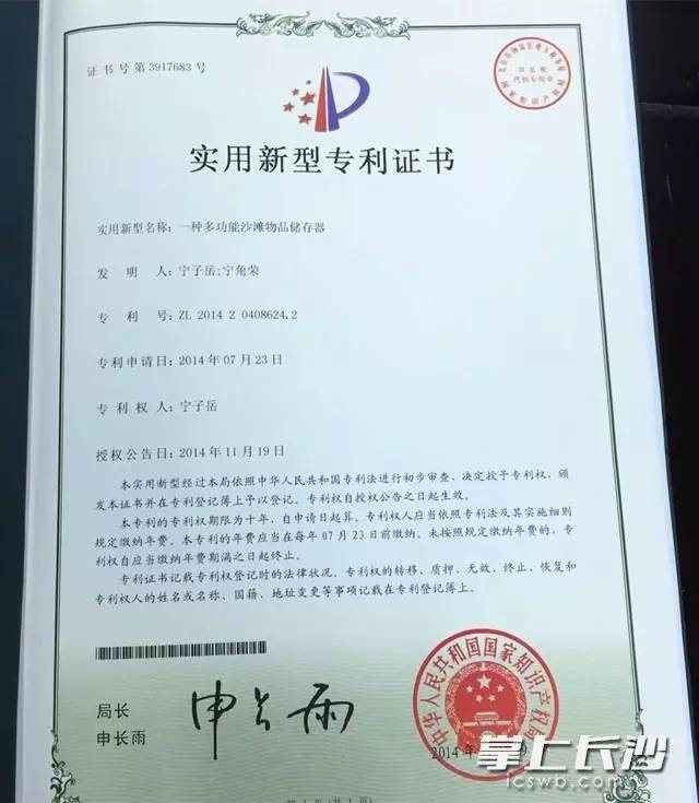 穿着泳衣在海边度假的时候,你是否也有手机、钥匙不知道往哪放的尴尬?寄存起来想用手机又不方便,长沙中雅培粹学校的一个13岁初一学生解决了这个难题,4月15日的首届湖南文创设计大赛颁奖现场,这个“小发明家”作为特邀嘉宾出现在现场,他发明的“多功能沙滩物品储存器”申请了国际发明专利,抢先有类似发明的美国麻省理工教授两天完成申请,得到了阿尔弗雷德教授的关注。