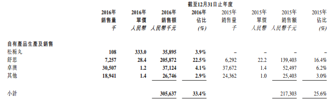 2016年,泰凌医药自有产品生产及销售的分部总收入增加了8830万至3.05亿,同比上升了40.6%。其中,松栀丸从2016年6月开始上市销售,期内贡献收入约3590万;舒思的收入为2.05亿,同比上升47.7%;而卓澳的收入则因分销商四环医药(00460)重组而减少了29.3%,只有3701万。
