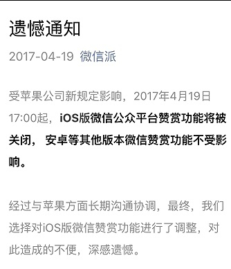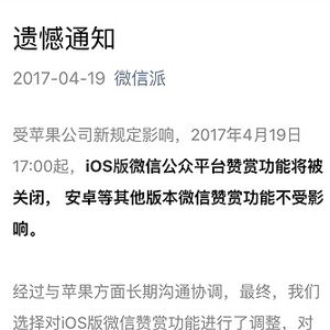 4月19日下午,腾讯微信团队发布“遗憾通知”:受苹果公司新规定影响,4月19日17时起,苹果iOS版微信公众平台赞赏功能将被关闭,安卓等其他版本微信赞赏功能不受影响。