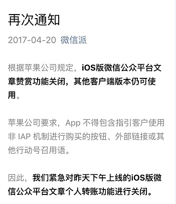 然而,过渡方案公布不到一天,4月20日凌晨,微信团队再次发布通知称,紧急对19日下午上线的iOS版微信公众平台文章个人转账功能进行关闭。