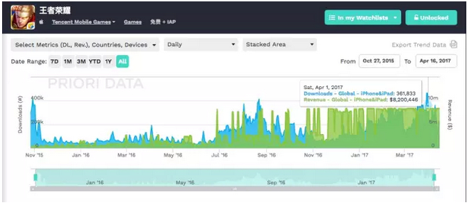 可以直观地看到,《王者荣耀》在上线初期的成绩并不好,游戏在运营一短时间后渐入佳境,目前收入稳定保持在高位。