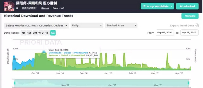 游戏的数据表现更能说明问题,下面两张图是《王者荣耀》与《阴阳师》的下载情况(蓝色)和收入(绿色)对比,有一个细节需要注意,《阴阳师》日下载量峰值约为《王者荣耀》一半,日收入的峰值接近。