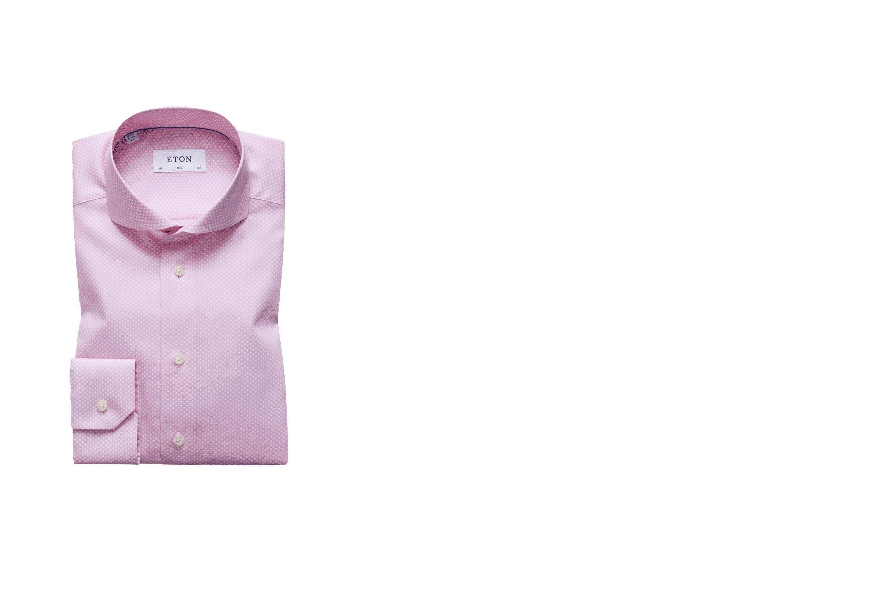 自左至右:Eton牌粉色、斜纹布、波点衬衫;布克兄弟(Brooks Brothers)牌粉色、牛津布、扣角领衬衫;Isaia牌粉色、花纹刺绣、正装衬衫