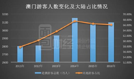 内地和港台等邻近地区是赴澳门游客的主要来源地。根据澳门官方的数据计算出,来自内地和港台的游客合计占比从2011年的80.63%增加到2016年90.3%。2016年访澳游客中约66.1%的来自中国内地,约2050万人次。