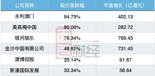 澳门几家主要的博彩集团股价借势反弹,总市值合计增加2300多亿港元。其中永利澳门自去年年初以来上涨94.75%,美高梅中国同期涨幅达80.06%,银河娱乐同期上涨76.34%。