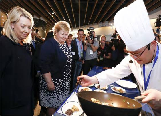 因此在本次访华行程中,挪威的官员们亲自上阵,向中国积极推销挪威海产。在北京和上海的行程中,首相索尔贝格两次充当“宣传员”的角色,试吃刚出炉的极具中式料理特色的椒盐鳕鱼,一再表示随着中挪关系正常化,一大波三文鱼和鳕鱼都会来到中国。