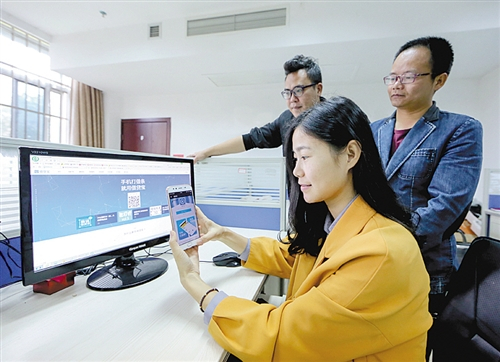 ▼ 4月19日,江西广昌县创业青年正在用手机扫描咨询小额贷款相关业务。为助力大众创业、万众创新,该县通过加强小额贷款公司监管,规范民间借贷行为,引导网络及民间小额贷款公司规范健康发展。叶红姣摄