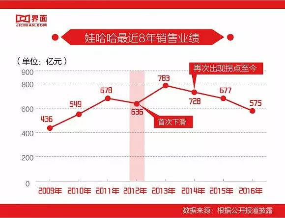 2010年,娃哈哈业绩进入500亿俱乐部,创始人宗庆后发出豪言,要达到1000亿的目标。7年过去了,不但目标没有实现,业绩还在2012年出现了拐点。