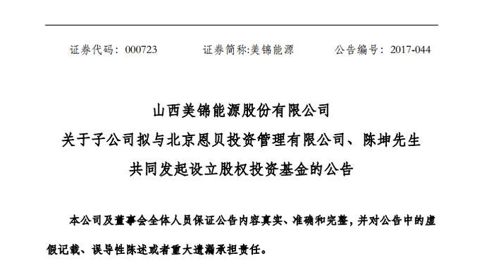 但遗憾的是,赵薇此举虎头蛇尾,没能善始善终,收购金额从30亿缩水至5亿,甚至最后宣告“流产”。也是多亏万家文化“好心”,才捡回1.5亿元违约金。赵薇的遭遇似乎没有吓退后来者。根据美锦能源公告,赵薇老同学陈坤将同公司一起设立股权投资基金,一出手就是5个亿!