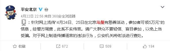 4月22日,北京警方通过平安北京官方微博辟谣。23日公安部通报,天津公安机关等地公安机关打掉了一个编造“慈善富民总部”的一个机构。24号,仍然有部分受骗群众来到鸟巢等地领取所谓的奖金,已经被警方劝离。奇了怪了吧,好了,其实我们很多人可能都非常非常奇怪。接下来就连线一位嘉宾,他可能会解除我们的这些好奇。