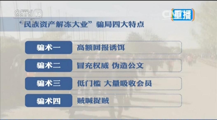 主持人:其实老年人很多也需要有成就感,也需要为民族复兴做很多的事情。这个骗局就激活了老人心中这样的一种欲望,被骗的同时,还升腾了一种很大的成就感和荣誉感。我们来看看它的骗局的几大特点,第一个是高额回报诱饵,你看着是很小的钱投入,10块钱,但是给你5万。骗术二,冒充权威,伪造公文,什么国家领导人各个部都在找他,你看刚才的片子,各个部都在找他。骗术三,低门槛,大量吸收会员,看似钱不多,但是有点像好多人打麻将不做大胡,屁屁胡,有一种名言叫“屁屁核武器”,这么多被骗的人,每个人交一点,骗子拿走的钱你想想有多少。骗术四,贼喊捉贼。怕露馅,因此告诉你这里水深着呢,你可不要轻易地就把事说明白了,等等等等。其实从媒体的报道2015年开始就有了,解冻民族资产等等等等。