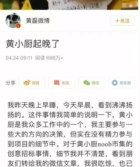 4月24日上午,黄磊通过个人微博回应称自己并不知情。他表示,自己并未参与到黄小厨具体项目的细节中,已对事件详细经过进行调查,如涉及抄袭,会承担责任,对责任人做出相应处理,并将实际情况公之于众。